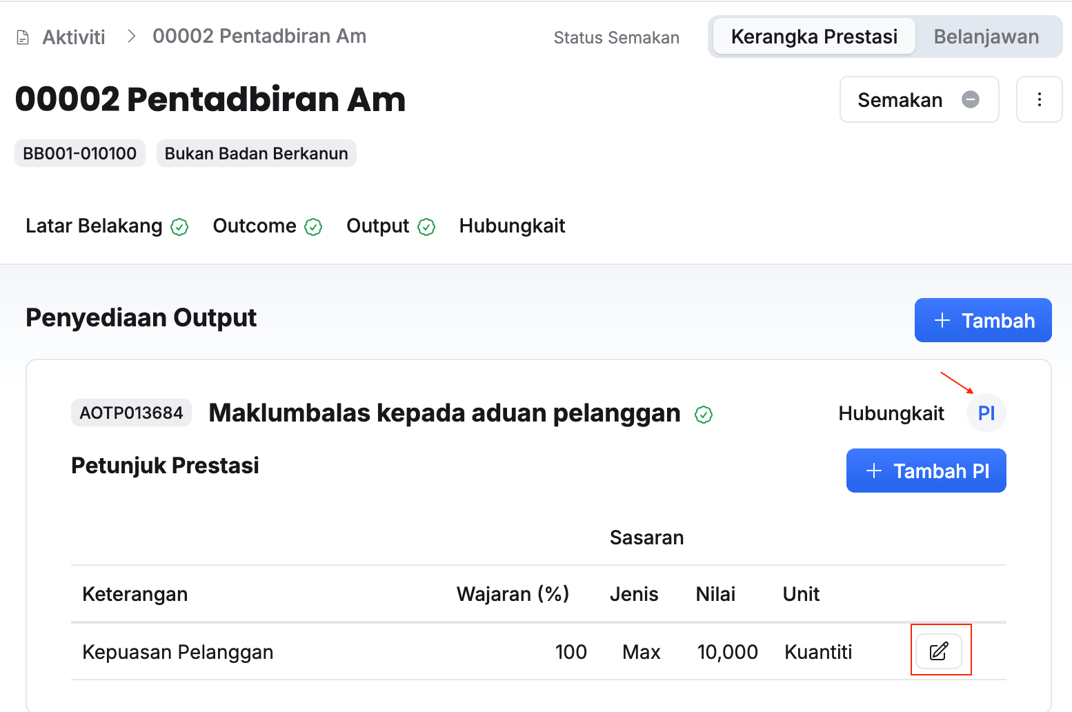 - Klik PI pada sudut kanan outcome yang berkaitan
