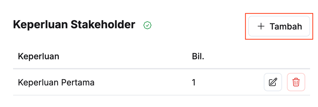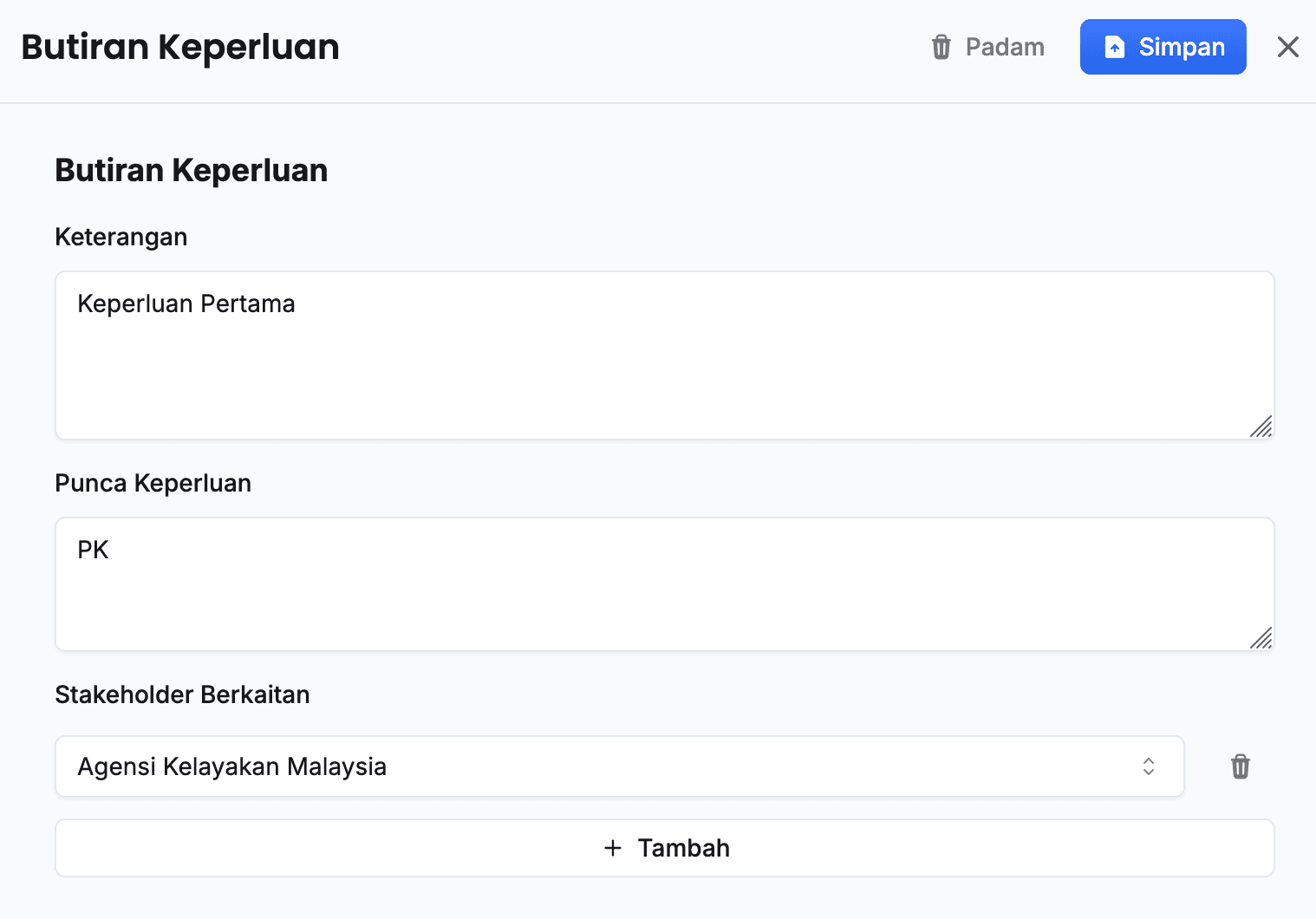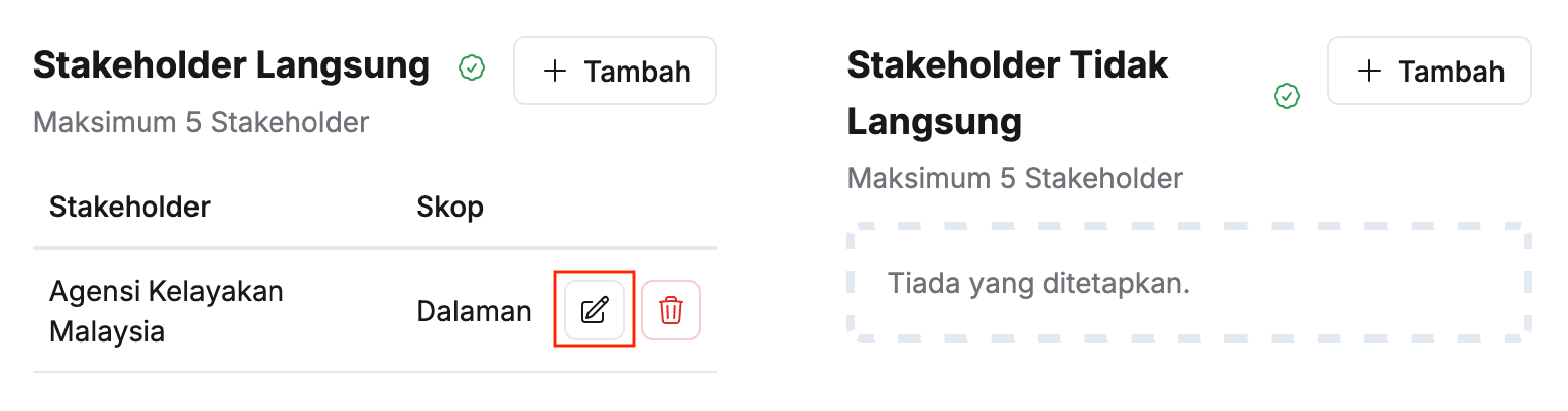 - Klik butang + Tambah pada sudut kanan tajuk Stakeholder Langsung / Stakeholder Tidak Langsung