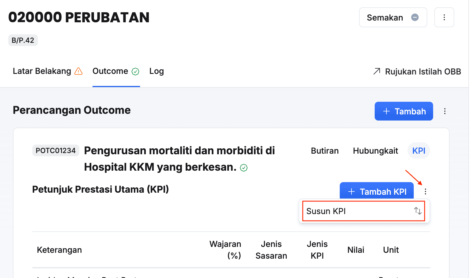 - Klik KPI pada sudut kanan outcome yang berkaitan