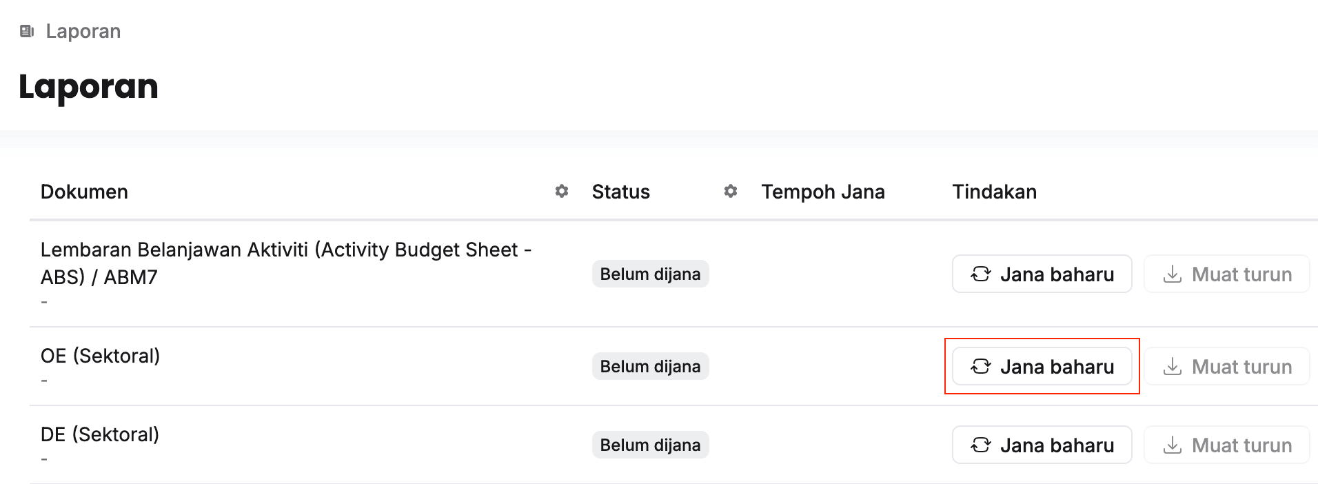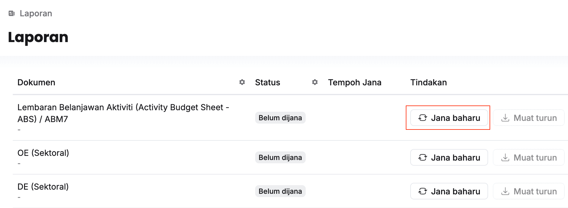 - Klik Jana baharu pada sudut kanan Lembaran Belanjawan Aktiviti (Activity Budget Sheet - ABS) / ABM7