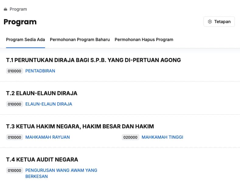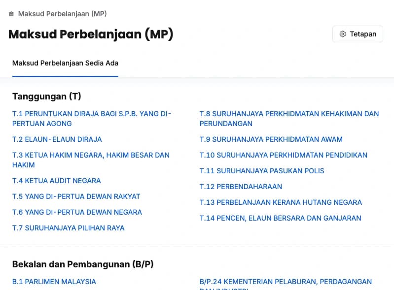 - Tab navigasi antara Perbelanjaan Mengurus (OE), Perbelanjaan Pembangunan(DE) dan Perjawatan