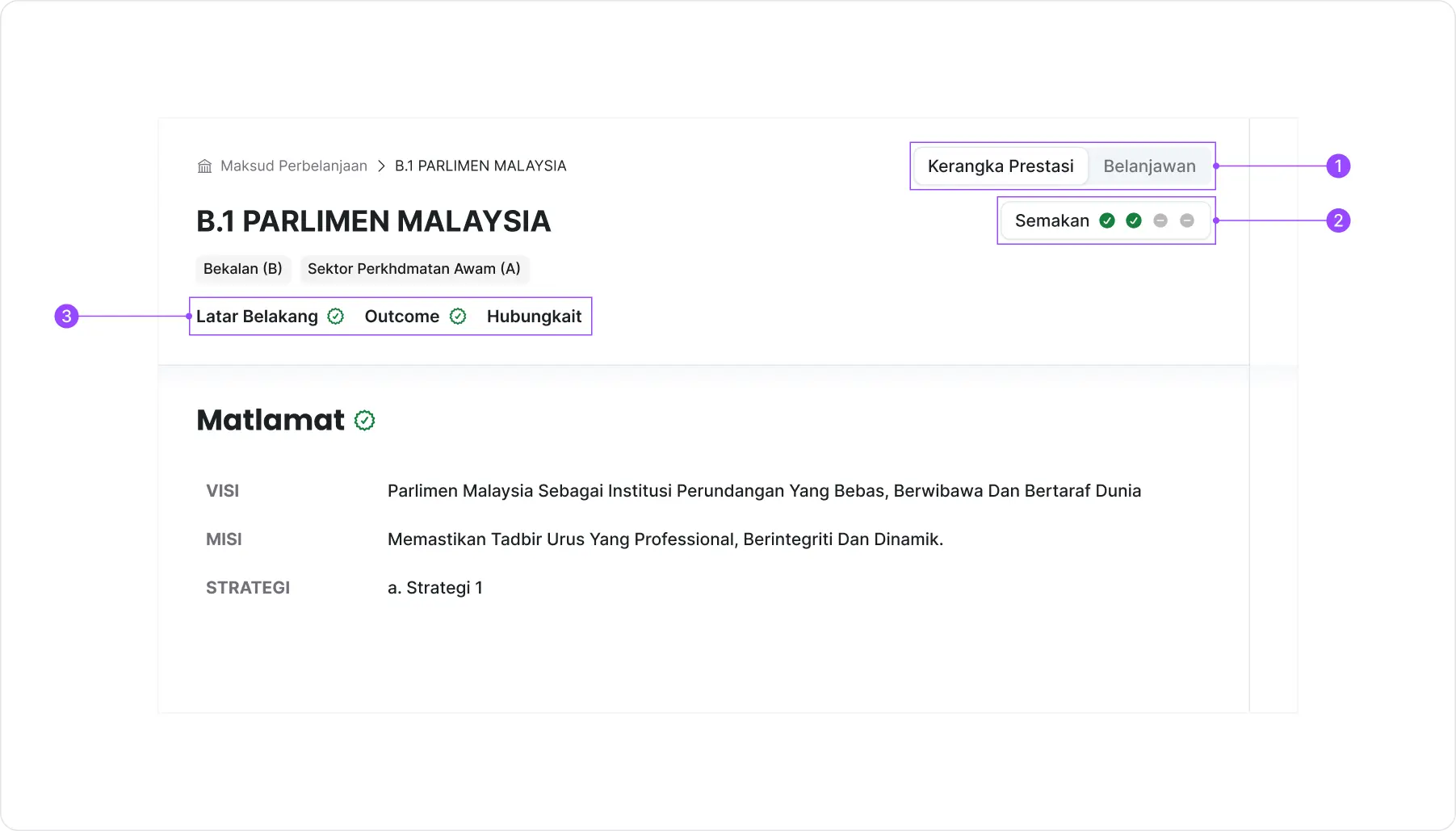 - Butang Togol untuk tukar halaman antara Belanjawan dan Kerangka Prestasi