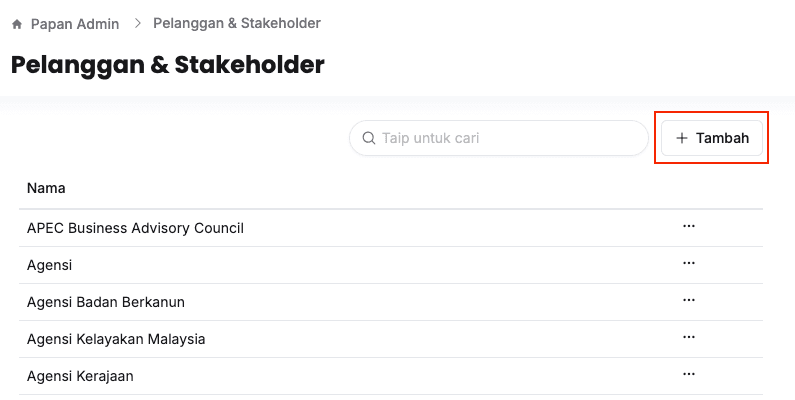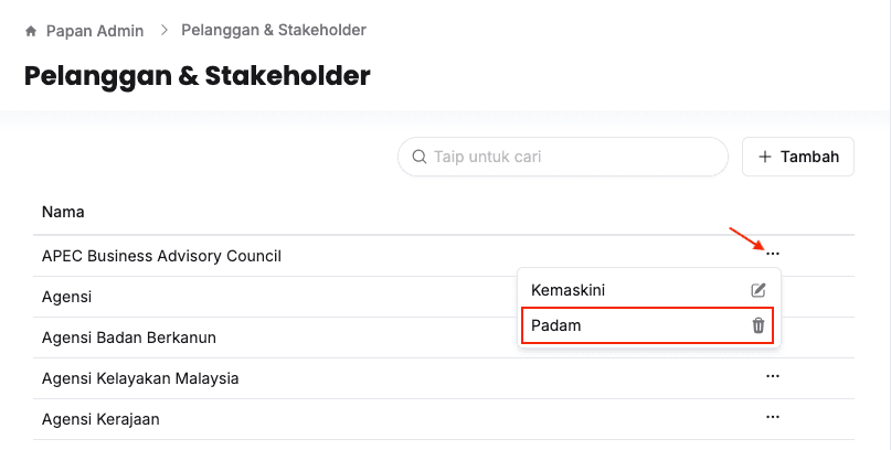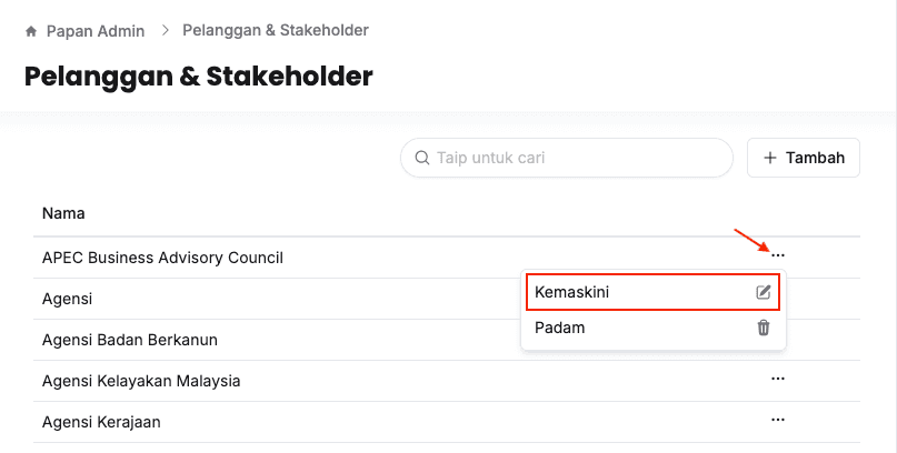 3. Klik butang 3 dots pada sudut kanan pelanggan/stakeholder yang berkaitan