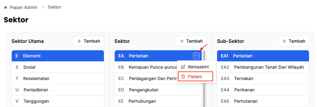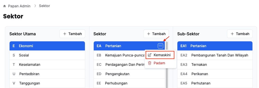 3. Klik butang 3 dots pada sudut kanan sektor utama/sektor/sub-sektor yang berkaitan